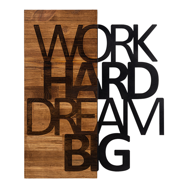 Ανεβάστε την ενέργεια και τη θετικότητα του χώρου σας με αυτό το μοναδικό ξύλινο διακοσμητικό τοίχου! Οι λέξεις “WORK HARD DREAM BIG” αποτυπωμένες με στυλ σε φυσικό ξύλο, αποτελούν μια καθημερινή υπενθύμιση για να κυνηγάτε τους στόχους σας με πάθος και αφοσίωση. Ιδανικό για το σπίτι, το γραφείο ή οποιονδήποτε χώρο θέλετε να εμπνεύσετε. Προσθέστε μια πινελιά ζεστασιάς και motivation στον τοίχο σας! Κάντε το δικό σας και δώστε ώθηση στα όνειρά σας!