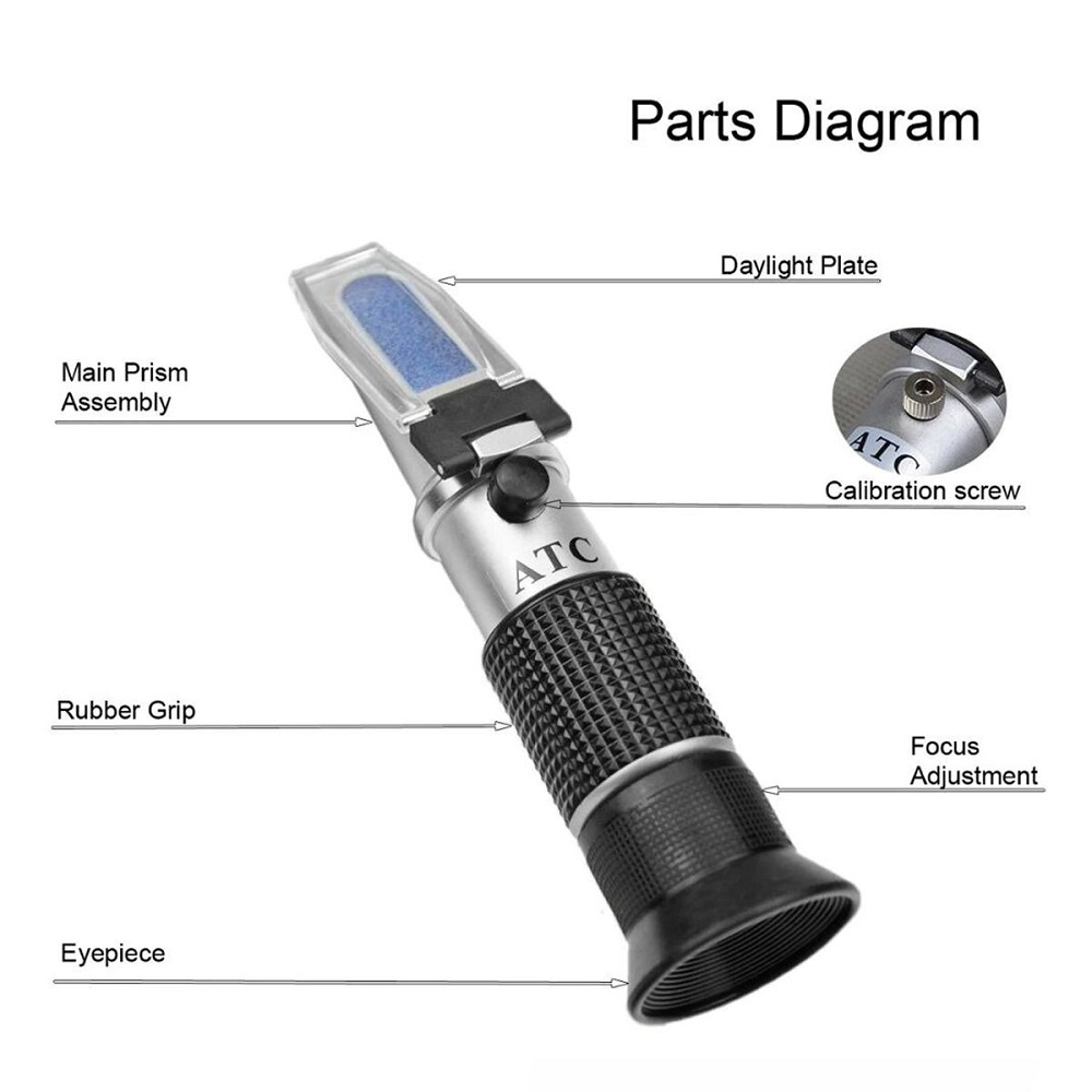 Διαθλασίμετρο για την μέτρηση περιεκτικότητας Αλκοόλ ,Σακχάρου και Baume σε ποτά (κρασί, μπύρα) ή χυμούς. Με την προσθήκη λίγων σταγόνων υγρού στο πρίσμα και κρατώντας το μετρητή σε μια πηγή φωτός. Με τεχνολογία ATC για έγκυρες μετρήσεις σε οποιαδήποτε θερμοκρασία. Κατάλληλο για επαγγελματική και ερασιτεχνική χρήση