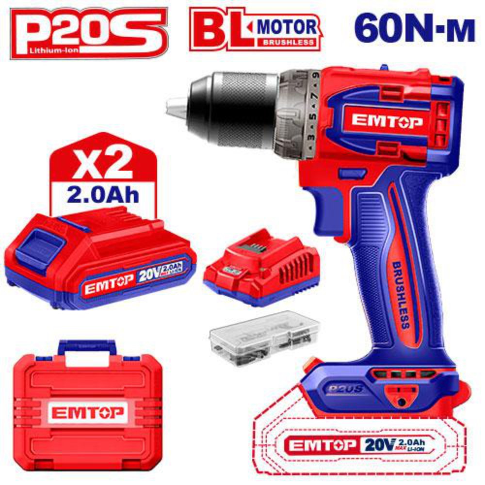 "Το brushless δραπανοκατσάβιδο της εταιρίας EMTOP διατίθεται με μία μπαταρία 2Ah/20V και ταχυφορτιστή 20V. Κατασκευασμένο με μηχανικό κιβώτιο 2 ταχυτήτων και αυτόματο κλείδωμα τσοκ. Διαθέτει ενσωματωμένο LED για εργασίες σε σημεία που δεν υπάρχει επαρκής φωτισμός.