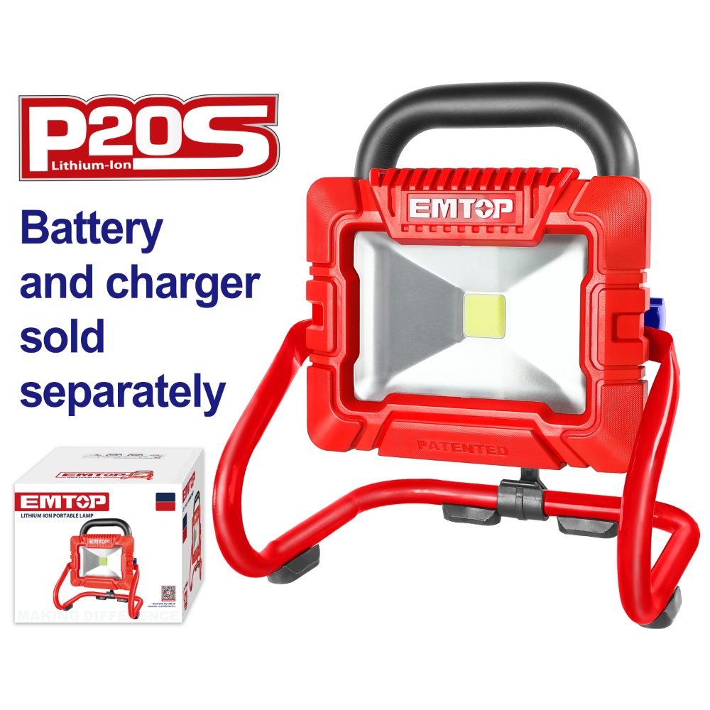 Προβολέας LED της EMTOP ισχής 20V, κατανάλωση ισχύος LED 20W, κατάλληλος για συνεργεία ή για χρήση σε χώρους όπως η αποθήκη. Tροφοδοτείται μέσω μπαταρίας. Η μέγιστη ισχύς της φωτεινότητάς του φτάνει έως 1800lm ενώ η χαμηλότερη έως 900lm.