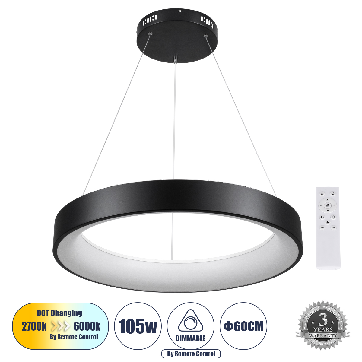 GloboStar® SALEM 61245 Κρεμαστή Πλαφονιέρα Οροφής Δαχτυλίδι-Κύκλος LED CCT 105W 12075lm 120° AC 220-240V – Εναλλαγή Φωτισμού μέσω Τηλεχειριστηρίου All In One Ψυχρό 6000k+Φυσικό 4500k+Θερμό 2700k Dimmable Φ60cm – Μαύρο – 3 Years Warranty