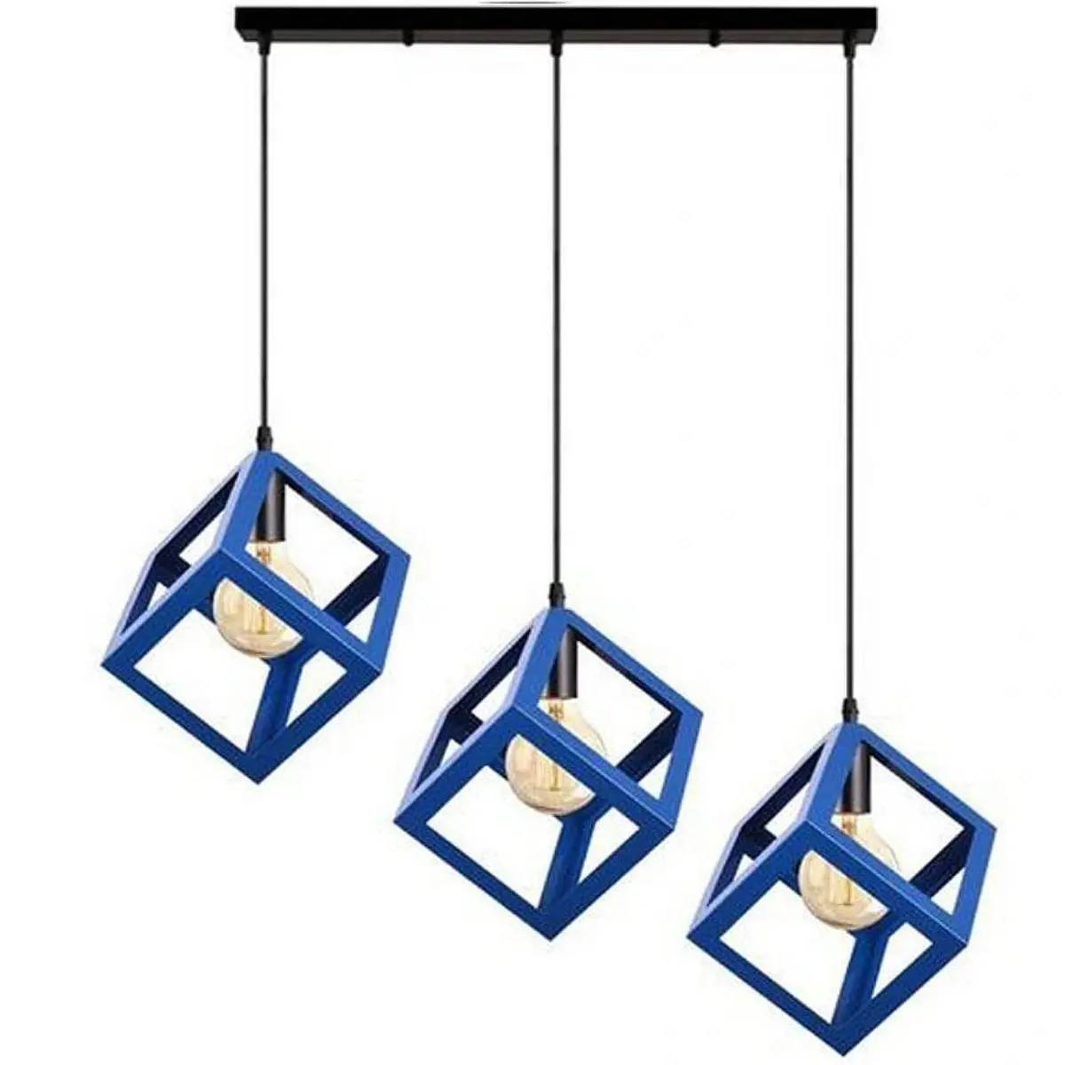 Φωτιστικό κρεμαστό τρίφωτο τετράγωνο κύβος μεταλλικό σε μπλε χρώμα με μαύρη ροζέτα (00500840). Έχει ένα ιδιαίτερο φωτιστικό σε vintage σχεδιασμό που θα εντυπωσιάσει και είναι ιδανικό για να διακοσμήσετε το χώρο σας και να δώσετε μια διαφορετική άποψη. Μπορεί να χρησιμοποιηθεί σε σαλόνι, κουζίνα, δωμάτιο, καφέ, μπαρ, εστιατόρια