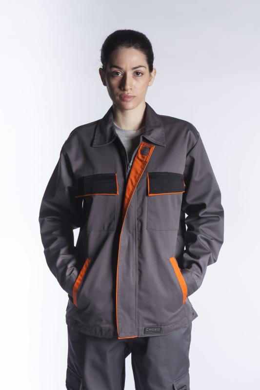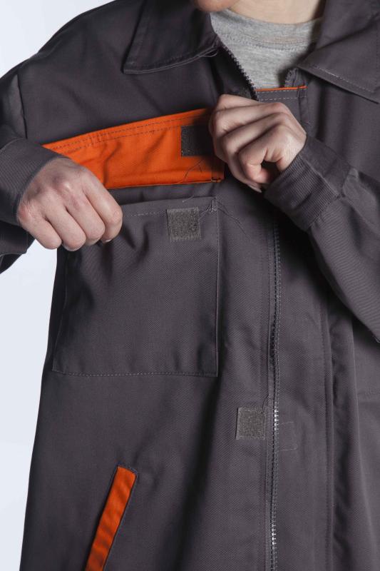 Σακάκι εργασίας άνετο με ευρύχωρες τσέπες στο στήθος και χρωματικό contrast στην πατηλέτα και στις τσέπες . Διαθέτει κουμπιά δύο θέσεων στα μανίκια και velcro στο πλάι για καλύτερη εφαρμογή στην μέση .